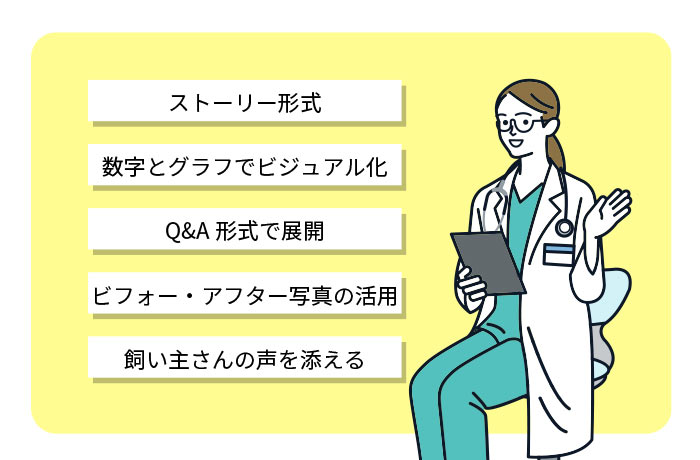 可能な範囲で、治療前後の写真を掲載します(もちろん飼い主さんの許可を得て)。「この研究により、このような改善が見られました」と視覚的に示すことで、研究の意義が伝わりやすくなります。
