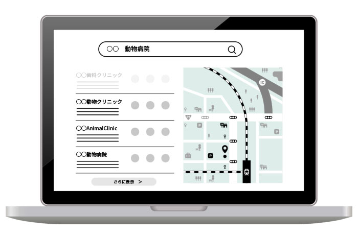 「〇〇市 動物病院」とGoogleで検索すると、地図と一緒に病院のリストが表示されます。このエリアに表示されるかどうかが、地域の飼い主さんに見つけてもらえるかどうかを大きく左右します。